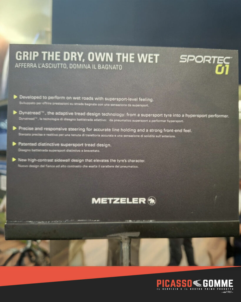 La grande novità per la guida sportiva è il Metzeler Sportec 01. Questo pneumatico ridefinisce il concetto di performance supersport, trasferendo l’esperienza della pista direttamente sull’asfalto di tutti i giorni. Il suo motto parla chiaro: “Afferra l’asciutto, domina il bagnato”.